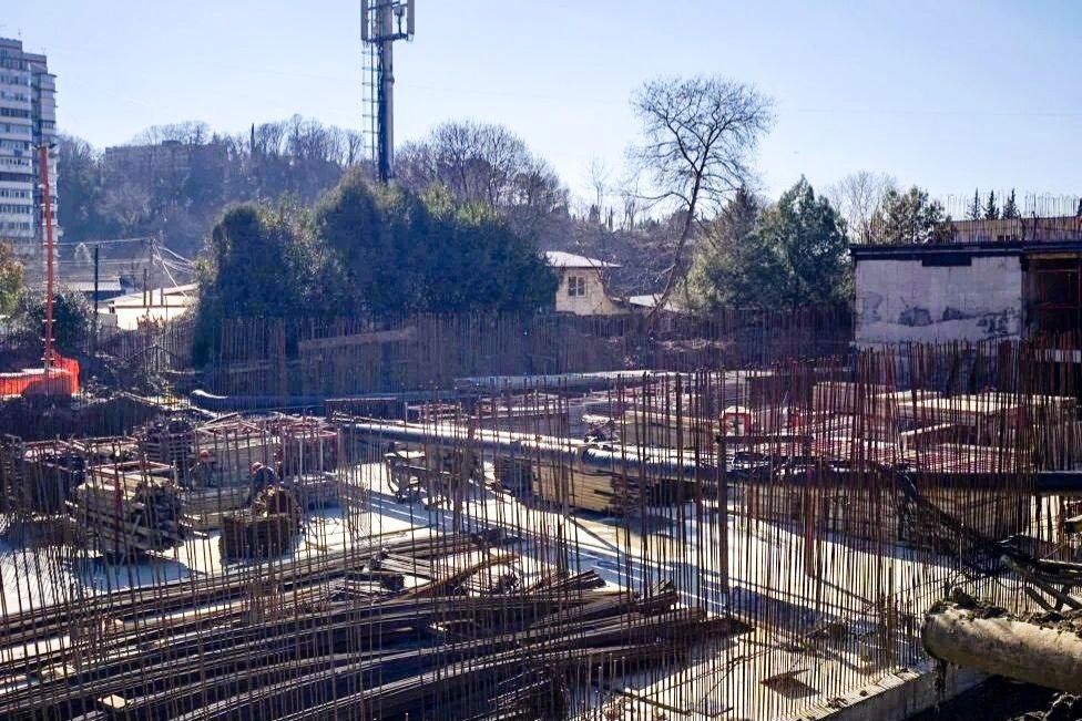 Новый подрядчик уже выполнил подготовительные работы: возвел строительный городок, смонтировал временные ограждения и систему видеонаблюдения. На площадке завершено армирование фундаментной плиты, в настоящее время ведутся работы по обустройству теплотрассы и вывозу излишков грунта.