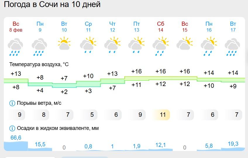 Долгосрочный прогноз «Гисметео» обещает для Сочи в середине февраля солнечную погоду с температурой около +16°C. Возможность провести время в тепле и совершать долгие прогулки привлекает многих туристов, уставших от зимних холодов.