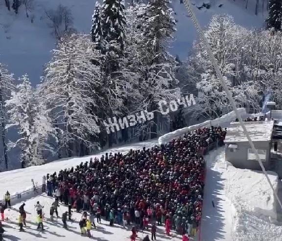 Пользователь frolov_freeride выложил кадры, снятые 5 февраля на Южном склоне курорта «Роза Хутор». На записи видно множество отдыхающих. «Ну что друзья, это наши знаменитые очереди, гляньте», — прокомментировал автор.