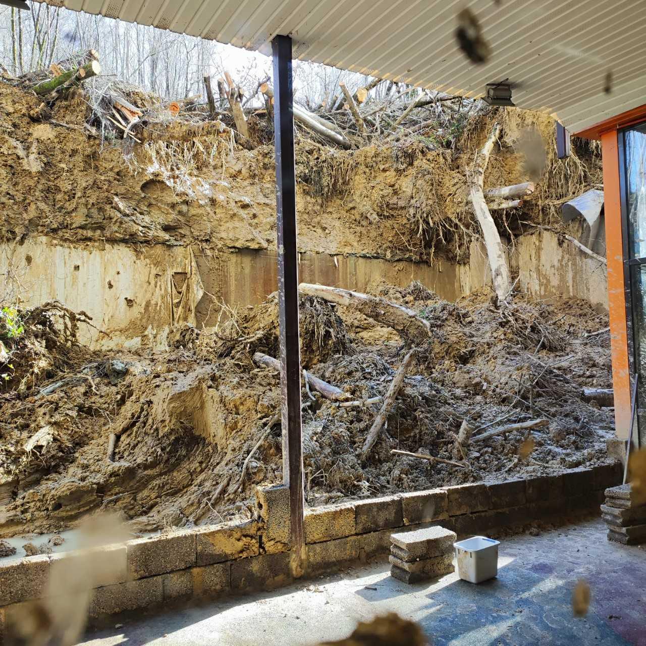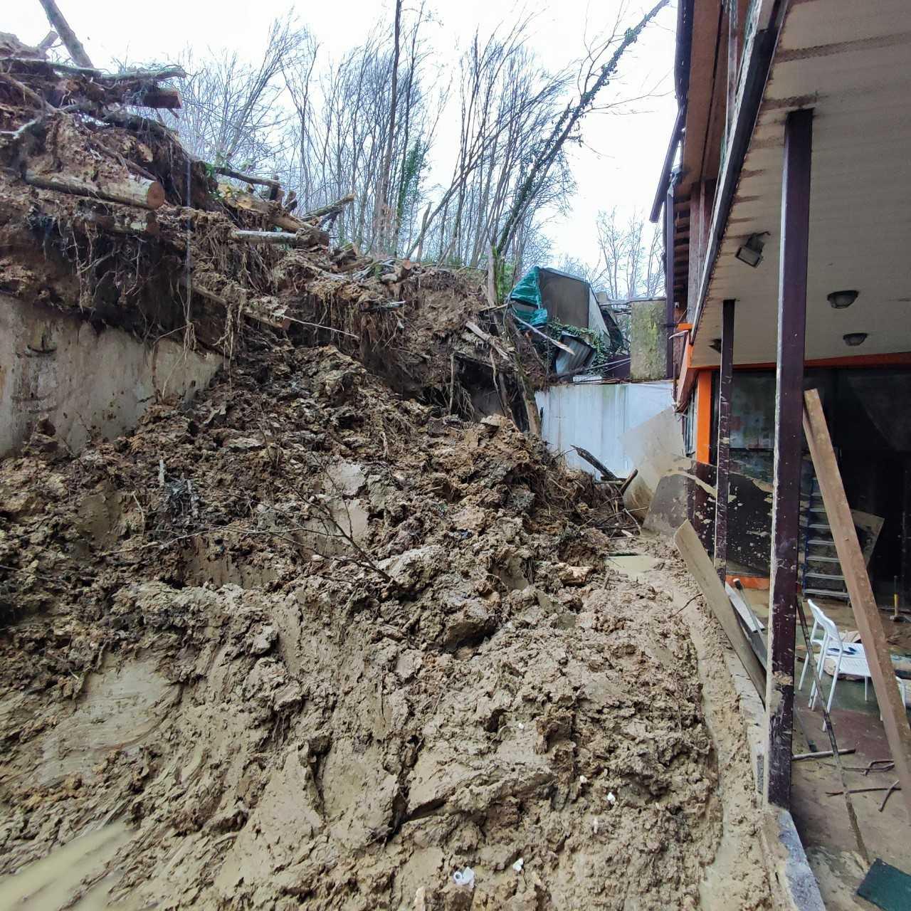 Сход грунта произошел 25 января, когда земля с крупными деревьями обрушилась со склона соседнего участка прямо во двор многоквартирного дома.