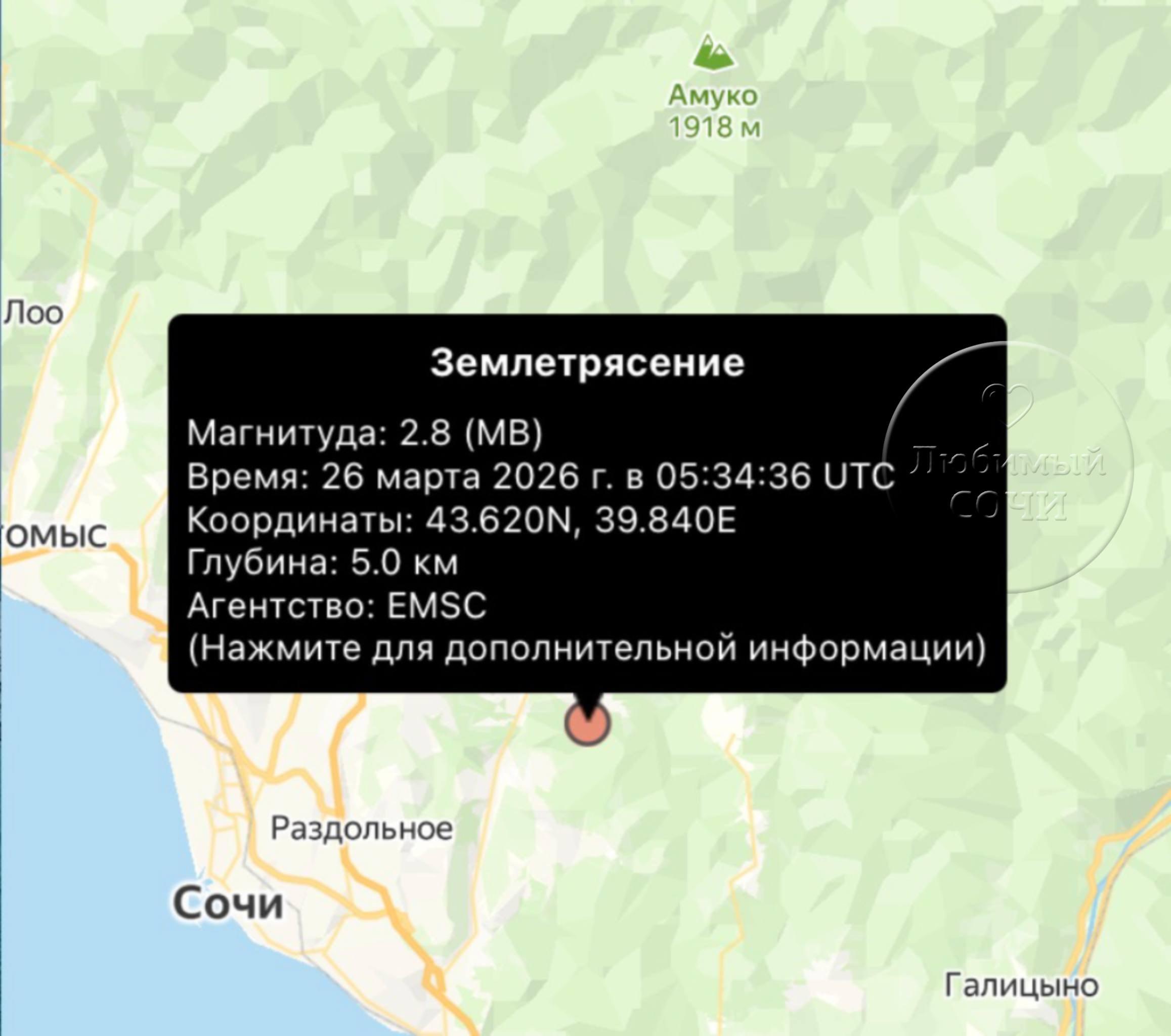 Евро-Средиземноморский сейсмологический центр зарегистрировал подземные толчки в окрестностях Сочи.