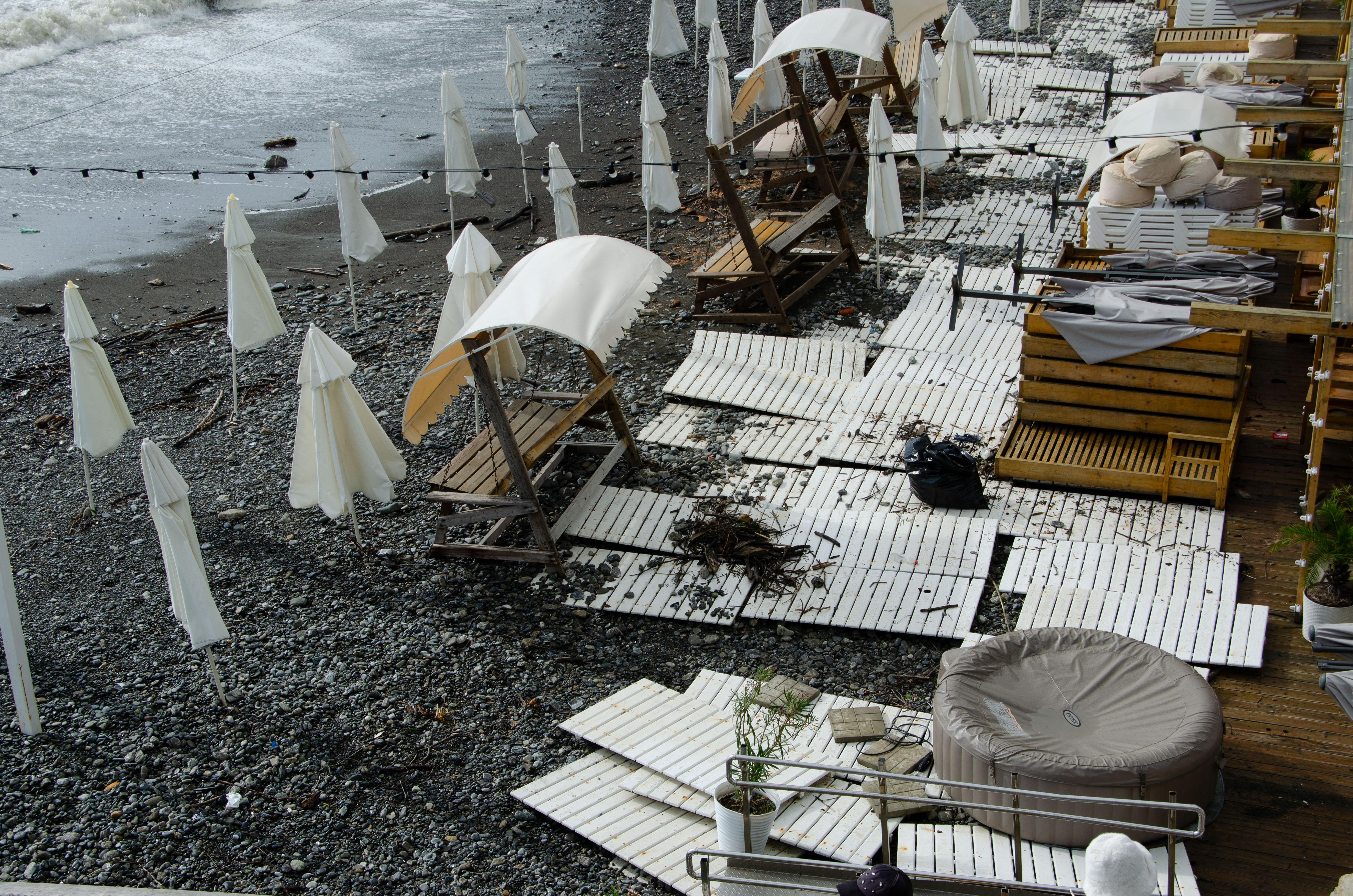 С пляжей водой смыло деревянные настилы, бунгало и кадки с растениями. На их месте на берегу в поселке Дагомыс теперь лежат груды бревен и веток.