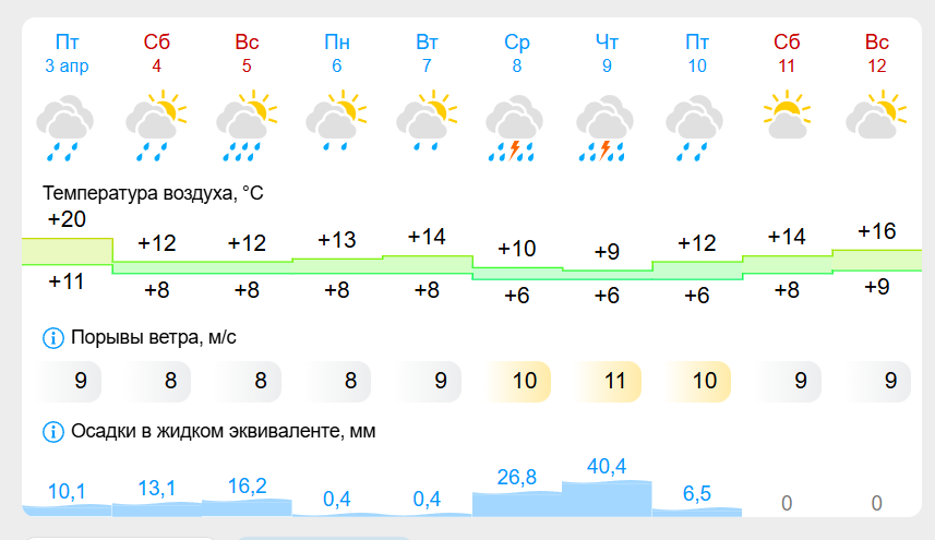 Вечером 3 апреля в Сочи и на федеральной территории Сириус прогнозируется ухудшение погодных условий. Ожидаются гроза и шквалистое усиление ветра с порывами до 15–17 метров в секунду. Утром и днём 4 апреля местами пройдёт сильный дождь. Температура воздуха, достигшая аномальных +20°C, понизится на 9 градусов — до +11°C.